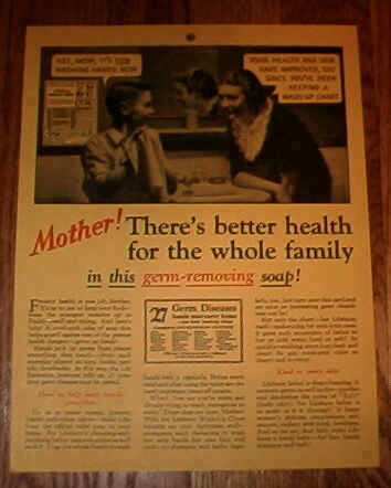 One side of heavy card stock poster (pin is at the top of the poster), contains "A word to Mother" urging use of Lifebuoy soap to kill germs and the diseases hands may carry home! There's better health for the whole family!